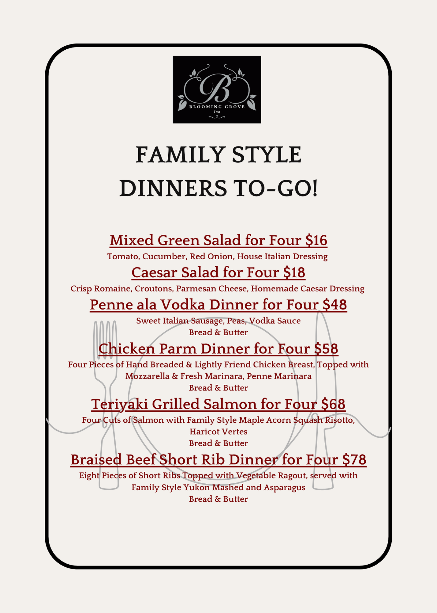 We'll be serving our Full Dinner Menu along with Specials from 12:30PM - 6:30PM on Thanksgiving Day. Specials will include our Famous Roast Turkey Platter with gravy, stuffing, mashed potatoes, sweet potatoes, green beans and cranberry sauce. Reservations are filling quickly! Call us today.